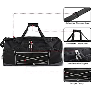GYM BAG: Extra large duffle bag with handles and front bungee cord is perfectly suited for carrying your sports items, dirty laundry, shoes, yoga mat, & even toiletries! Bring it all with you and never be unprepared