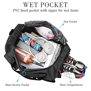 👍【MULTI-FUNCTION POCKETS】The womens gym bag features multi-pocket design—1 spacious main pocket, 1 shoe compartment, 3 exterior pocket and a wet pocket for wet clothes, toiletries or towels,keeping all your essentials well organized.