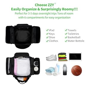 This sports duffel bag with 1 main compartment (20″ x 12″ x 10.5″ / 50cm x 30cm x 26cm), 2 side compartments and 2 front pockets for extra storage.