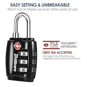 TSA APPROVED: 100% TSA Recognized and Accepted Lock allows TSA staff to inspect and relock your baggage without damaging the lock at 600+ airports around the world. You have 1,000 possible encryption combinations that provide greater security