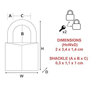 DIMENSIONS: (HxWxD) 2 x 3.4 x 1.4 cm; shackle (A x B x C) 0.3 x 1.1 x 1 cm; pack of 2 black padlocks; 2 keys included