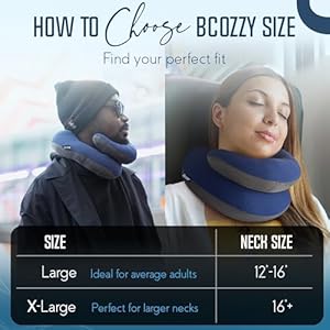 DOUBLE SUPPORT TO THE HEAD, NECK, AND CHIN- The Patented BCOZZY pillow is the only pillow that provides doubled support which helps relax and prevent neck pain and sore shoulders when sleeping while sitting upright in an airplane, car, or at home. Available in two sizes for adults, the Large size for neck size up to 16”, and X-Large size for neck size 16” and above, the BCOZZY travel pillow is one of the most favorite travel accessories and travel gifts.