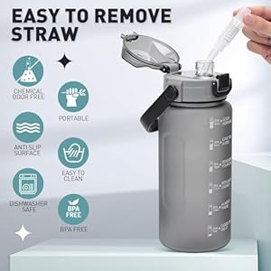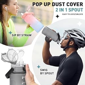 Leakproof Drink Bottle:The water jug lid with safety lock and silicone seal ensure no leaking when carrying the bottle in your bag. The dustproof straw cover makes you need not to worry about dirt and dust.